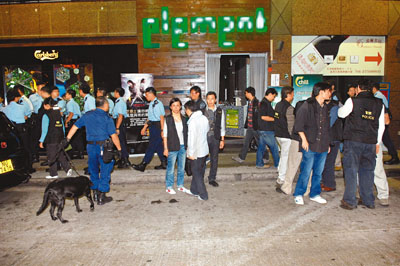其間,有組織罪案及三合會調(diào)查科聯(lián)同反黑組及機動部隊共50多人,帶同一頭緝毒犬,于昨凌晨2時30分,掩至尖沙咀寶勒巷3號至7號萬事昌商場,逐一突擊搜查上址多間娛樂場所;另外又到赫德道一帶多間夜店進(jìn)行查牌,并向可疑人士查閱身份證明文件,行動持續(xù)10小時。