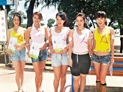 張家瑩、吳嘉星及筱靖各人身穿印有亞洲小姐標(biāo)志的T恤,拉隊(duì)到淺水灣向沙灘上具有潛質(zhì)的女泳客招募參選。