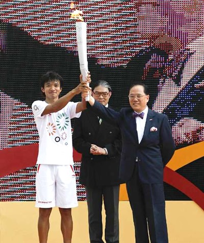 火炬?zhèn)鬟f的起步儀式,昨午三時在九龍公園的露天廣場舉行。此次大會安排了六十五名火炬手負(fù)責(zé)火炬?zhèn)鬟f,當(dāng)中八成是運動員,煥發(fā)著青春活力。去年奧運圣火在香港傳遞時,分別跑第一棒的李麗珊和跑最后一棒的黃金寶,昨日互換位置,由黃金寶跑第一棒,李麗珊負(fù)責(zé)壓軸一棒;鹁嬗杉馍尘组_始傳送,經(jīng)過一段海路,最后到達(dá)金紫荊廣場,歷時個半小時。