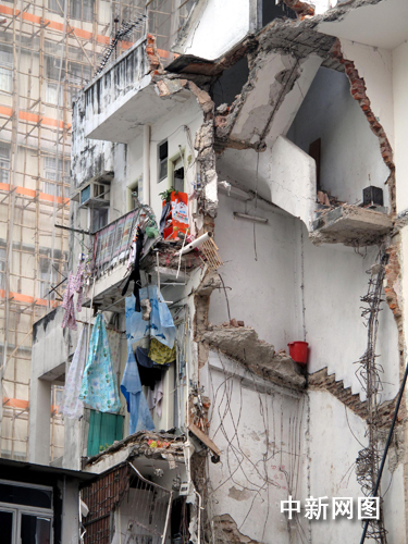 在微風(fēng)中,懸在剝露于外的墻壁上的美女海報、來不及收的晾曬衣物和家當(dāng),沿著樓梯痕跡排列的七倒八歪的信箱、放在已成為“懸崖”的墻角處的紅色膠桶、鐵架床床頭的毛絨玩具……訴說著一個個已不復(fù)存在的故事。震撼猶存,更令人唏噓。