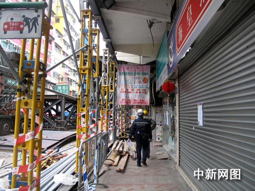 馬頭圍道塌樓周圍的善后工程仍在進行。但在臨時鋼架支撐的樓房內(nèi)的生活,自然不會踏實。同一排灰黃色的唐樓下,幾家店鋪仍開著門,生意似乎都較冷清。反倒是最靠近事故現(xiàn)場的那家掛著大大的“拆樓”布幅的雜貨鋪內(nèi),來幫襯的街坊要多些。街對面的北帝廟,依然青煙裊裊。