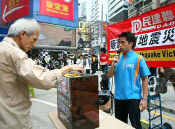 多個(gè)政黨、團(tuán)體和商業(yè)機(jī)構(gòu)均以不同方式參與賑災(zāi)行動(dòng),包括街頭和商場義賣、獻(xiàn)唱、大球場義賽等,市民紛紛慷慨解囊,祈求為災(zāi)民獻(xiàn)出一分力。