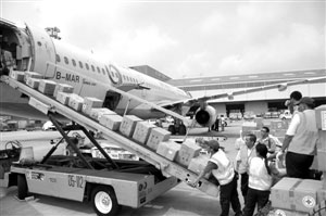 五月十八日,澳門救助四川地震災(zāi)民的首批救災(zāi)物資在澳門國(guó)際機(jī)場(chǎng)裝倉(cāng)啟運(yùn)。由澳門紅十字會(huì)及澳門街坊總會(huì)認(rèn)購(gòu)的這批救災(zāi)物資包括奶粉、毛毯、食品、電筒等災(zāi)區(qū)急需的物資共十二噸。這些物資由澳門航空公司免費(fèi)運(yùn)送,將于當(dāng)日下午抵達(dá)成都雙流國(guó)際機(jī)場(chǎng)。 中新社發(fā) 史利 攝