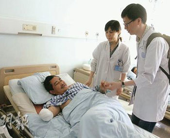 臥在病床上的賈大夫,破爛的腸臟已縫補(bǔ)好,情況穩(wěn)定過來,但因雙臂和盆骨都折斷,動(dòng)也不能動(dòng),深切體會(huì)能醫(yī)不自醫(yī)的無奈。他坦言,若不是身受創(chuàng)傷,他應(yīng)是在災(zāi)場上救援的一員,但目前只能等待由香港到來的醫(yī)生為他動(dòng)手術(shù)!罢娴暮芨兄x香港醫(yī)生愿意前來幫忙……很有心……”