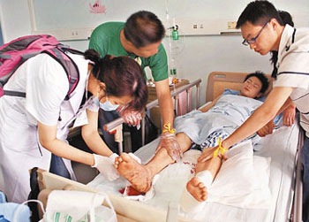 男孩傷在腳底,大大小小的有很多傷口,左腳更有一塊長(zhǎng)約10厘米的縫針傷口。見(jiàn)到男孩,尹淑玲先側(cè)身一笑,說(shuō):“大男孩,換繃帶或會(huì)很痛啊。”說(shuō)完便俯身利索地替他拆換繃帶。