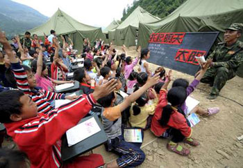 聚源中學(xué)的學(xué)生在復(fù)課日里起誓,說要安心學(xué)習(xí),回報(bào)社會。北川中學(xué)高三學(xué)生劉倩在日記中寫道:“我們有義務(wù)與責(zé)任盡自己所能去重建我們的家園。請重新樹立起信心吧,中華民族從來都是打不垮的,中國人民從來都是不屈不撓的,我們已經(jīng)與死亡握過了手,我們還有什么可畏懼的呢……讓我們互牽友愛的手,用愛去敲響我們的未來……請相信災(zāi)難后的我們會是永遠(yuǎn)的勝利者!庇纱,記者看見,充滿希望的未來正在讀書聲中醞釀?wù)Q生。