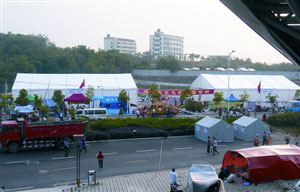經(jīng)過(guò)兩日兩夜路程,捐贈(zèng)物資于17日晚運(yùn)抵地震重災(zāi)區(qū)之一的綿陽(yáng)。在綿陽(yáng)市教育局、值班警員、志愿者及體育館內(nèi)災(zāi)區(qū)民眾的大力協(xié)助下,經(jīng)過(guò)近30個(gè)小時(shí),兩頂超大帳篷終完成安裝。