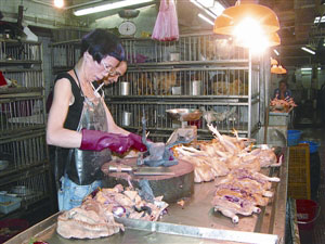 圖:澳門街市雞販戴手套操作,注重清潔衛(wèi)生。(圖片來源:澳門日?qǐng)?bào))