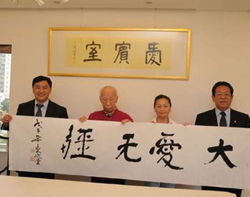 在這個(gè)“愛心書畫義賣區(qū)”內(nèi),最矚目的是國學(xué)大師饒宗頤教授親筆所寫的“大愛無疆”,這四個(gè)大字已被香港潮屬總會名譽(yù)會長高佩璇居士以500萬港元義購,可謂一字百萬金。在這里,最珍貴的不是這些字,也不是這筆捐款,而在于它帶來的情感上的震撼,一種骨肉相連、發(fā)自肺腑的真情。
