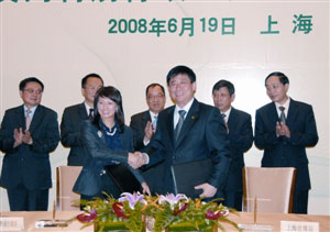 在經(jīng)濟(jì)財(cái)政司司長(zhǎng)譚伯源及上海市委常委、上海市常務(wù)副市長(zhǎng)、2010年上海世博會(huì)執(zhí)行委員會(huì)常務(wù)副主任楊雄等的見證下,上海世博會(huì)澳門籌備辦公室主任楊寶儀及上海市副秘書長(zhǎng)、上海世博局局長(zhǎng)洪浩代表雙方簽署協(xié)議。