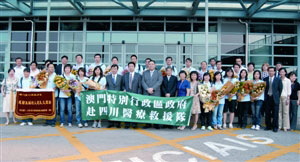 四川汶川大地震后,由澳門特區(qū)政府派出的第二支醫(yī)療隊(duì)21名醫(yī)療志愿人員,23日完成在南充市中心醫(yī)院的支持工作,并于下午4時(shí)20分飛返澳門。社會(huì)文化司司長崔世安、中聯(lián)辦文教部部長劉曉航、衛(wèi)生局長李展?jié)、鏡湖醫(yī)院慈善會(huì)秘書長吳培娟,以及澳門多個(gè)醫(yī)護(hù)團(tuán)體負(fù)責(zé)人到機(jī)場迎接。