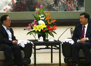 在粵港合作第十一次聯(lián)席會(huì)議舉行前夕,汪洋在廣州珠島賓館會(huì)見了參加粵港聯(lián)席會(huì)議的特首曾蔭權(quán)及政務(wù)司司長唐英年、政制事務(wù)局局長林瑞麟等香港特區(qū)政府官員一行。