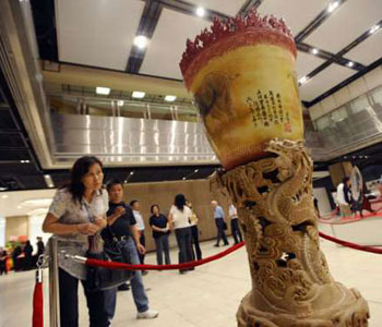 香港首屆紫荊花杯國際文化藝術(shù)博覽會19日起至21日在香港展覽中心舉行,展出280件全國各地名師名家的陶瓷以及字畫作品,國家青瓷泰斗徐朝興的成名珍藏作品三環(huán)瓶,白瓷領(lǐng)軍人物蘇清河的代表作品魚籃觀音,還有描繪國務(wù)院總理溫家寶指揮抗震救災(zāi)的油畫等,均是出現(xiàn)在此次博覽會的藝術(shù)珍品。