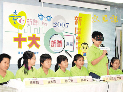 負責舉辦選舉的香港小童群益會第4屆“香港小特首”,上月分別通過表格及網(wǎng)上投票進行“童心新聞眼2007十大新聞選舉”,吸引28996名小四到中三學生參與投票,從30則候選新聞中選出心中的十大新聞,榮獲首3名的新聞依次為“熊貓‘盈盈’、‘樂樂’抵港 慶祝回歸10周年”、“哈利波特大結(jié)局 風靡全球”及“嫦娥一號發(fā)射成功 探月夢想逐步成真”,分別取得18172票、16474票及15054票。
