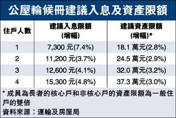 加上參考非住屋開支增幅后,房署建議提高輪候冊入息及資產限額,平均增幅5.5%及3.1%。單身人士入息限額由現(xiàn)在月入6800元,建議調升為7300元,增幅達7.4%,資產限額建議由現(xiàn)在17.6萬元,調升為18.1萬元。4人家庭入息限額就建議增為15300元,增幅4.8%,資產限額建議加至37.3萬元。