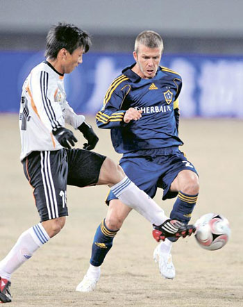 這次洛杉磯銀河“亞洲之旅”共分韓國首爾、中國上海及香港3站,貝克漢姆5日于上海八萬人體育場帶領(lǐng)銀河以3﹕0擊敗東亞晨曦聯(lián)隊(duì)。貝克漢姆正選上陣,披甲70分鐘,并貢獻(xiàn)了1次助攻。