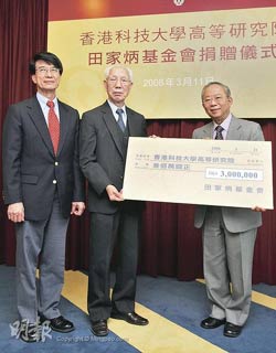 據(jù)香港媒體報(bào)道,田家炳基金會(huì)捐款300萬(wàn)元給科大高研院,加上政府的配對(duì)基金,成立600萬(wàn)元的“田家炳教育基金”;饡(huì)主席田家炳、科大校董會(huì)主席陳祖澤及校長(zhǎng)朱經(jīng)武11日出席了捐贈(zèng)鳴謝儀式。
