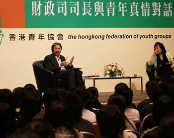 曾俊華在見面會開始之初就明確表示,歡迎學(xué)生發(fā)問任何問題,鼓勵他們切勿過分緊張!澳銈冇腥魏蜗敕ǎ蛘吣銈冎烙H戚朋友有什么看法,都盡管提出來。如果你們覺得預(yù)算案是稍為沉悶的話,你們可以提出其它比較有趣的話題!