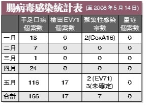 新證實(shí)的4宗EV71陽(yáng)性個(gè)案包括:1例為同善堂第二托兒所幼兒;1例為濠江小學(xué)二年級(jí)學(xué)童,其弟為已停托的同善堂第二托兒所的幼兒,較早前亦有皰疹性咽峽炎癥狀;1例為仁伯爵綜合醫(yī)院因其它疾病住院的幼兒,在常規(guī)檢查中發(fā)現(xiàn),并無(wú)腸病毒感染的癥狀,14日已出院;1例為未入學(xué)或入托的門(mén)診病人。