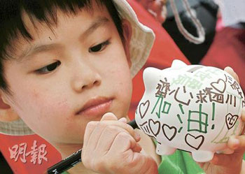 海港城舉行籌款活動,讓孩童在白瓷“熊貓錢罐”上繪畫,對四川災(zāi)民送上祝愿。(圖片來源:明報)