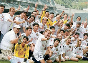香港不少團體18日為四川地震災(zāi)民籌款,明星足球隊(圖)在大球場舉行慈善賽,與由警隊“一哥”鄧竟成助陣的足總邀請隊友賽。(圖片來源:明報)