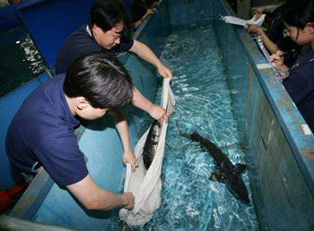 由于北京海洋館的中華鱘是一直在淡水環(huán)境下生活,所以在赴港前,三尾中華鱘都進(jìn)行了一段時(shí)間的海化訓(xùn)練,使其能在海水環(huán)境中適應(yīng)生存。北京海洋館總經(jīng)理胡維勇表示,將會(huì)有兩名北京方面的專業(yè)飼養(yǎng)員隨同赴港。在此之前,已有部分香港海洋公園的工作人員在北京接受了一個(gè)星期的培訓(xùn)。