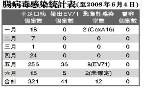 圖:腸病毒感染統(tǒng)計(jì)表(至2008年6月4日)。(圖片來源:澳門日?qǐng)?bào))