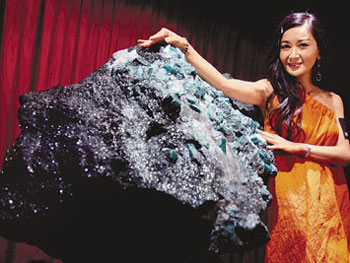 資料圖:港姐楊洛婷在香港抱趣堂藝術館內向傳媒介紹綠寶石原生礦。當日,該館展示法國留尼旺島開采出來的,一個重達五百三十六公斤,長達一百二十五厘米,闊七十八厘米及高五十五厘米的綠寶石原生礦。據(jù)稱,該礦石是目前世界上最大的寶石原生礦。 中新社發(fā) 洪少葵 攝
