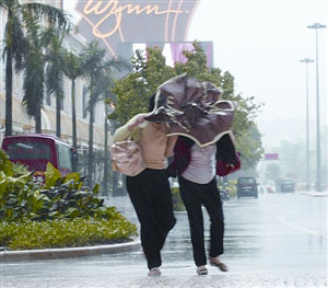 香港24日晚懸掛8號(hào)風(fēng)球,往來港澳客船全面停航,外港碼頭25日上午已滯留逾百旅客。至客船復(fù)航,場(chǎng)內(nèi)旅客有序離澳。25日天氣惡劣,強(qiáng)風(fēng)勁吹,時(shí)有傾盆大雨,即使居民帶備雨具,仍被強(qiáng)風(fēng)吹至東倒西歪、狼狽不堪,市面顯得冷清。澳門及離島多處出現(xiàn)塌樹、棚架倒塌及路陷事故,不少招牌被強(qiáng)風(fēng)吹至搖搖欲墜。
