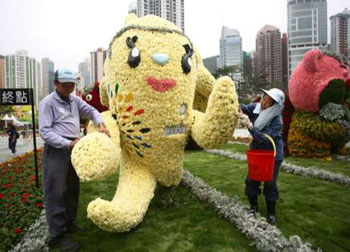 香港康文署主辦的2009香港花卉展覽由13日至本月22日在維園舉行。為配合迎接東亞運動會的主題,現(xiàn)場放置用4萬株花卉嵌植成的大型展品“萬花喜迎東亞運”,配合煙花、奧運五環(huán)等花卉組圖,烘托出喜迎東亞運動會的氣息。