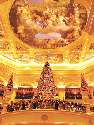 澳門的議事廳前地那一棵足有兩三層樓高的許愿樹燈飾會(huì)讓你眼前一亮,一層層藍(lán)盈盈小燈密密圍著,絲毫不會(huì)露出光裸電線,底下是制作頗為精細(xì)的大雪人,禮物堆,可愛得幾乎每個(gè)經(jīng)過的路人都忍不住要掏出手機(jī)去拍一張,小孩子更不用說了,嚷嚷要媽媽放開手好讓他爬上去拆禮物,看得人忍不住要會(huì)心微笑。然后郵政局門口那一棵許愿樹也十分華麗,而且是很別出心裁地“長(zhǎng)”在了大門口,叫進(jìn)出的人都覺得自己是在天使庇佑之下似的,忍不住要在心里許個(gè)小小愿望。即使是在普通的非鬧市區(qū),馬路上也掛上了串串燈飾,顯得氣氛特別濃。至于各大娛樂場(chǎng)所里面的許愿樹,更是一棵賽一棵的漂亮,一層樓高的是小意思,兩層樓高的是普通規(guī)模,最夸張的是威尼斯人度假村,幾乎每隔一段距離就有一棵或大或小的許愿樹,上面還很細(xì)心地掛滿了蝴蝶結(jié)、許愿球、小禮物、小襪子……看得人又忍不住要掏手機(jī)來玩自拍,不過即使一棵一張,估計(jì)即使是512M的卡都會(huì)不夠用呢。