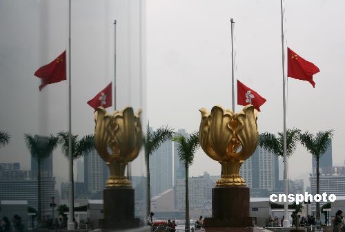 五月十九日是全國(guó)哀悼日,香港金紫荊廣場(chǎng)下半旗,對(duì)四川大地震遇難者表示深切哀悼。 中新社發(fā) 武仲林 攝
