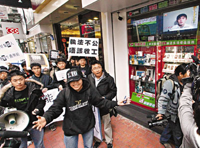 網(wǎng)民沿途高叫口號(hào)及展示標(biāo)語,游行人士途經(jīng)一間店鋪時(shí),店外電視正在播出早前陳冠希的道歉錄像,隨即惹來網(wǎng)民起哄,大呼“選擇性執(zhí)法可恥”等口號(hào)。