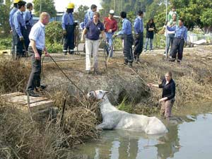 消防接報(bào)趕至,欲合10多人之力拉馬上水,但白馬大驚掙扎不肯上岸,馬場(chǎng)職員唯有不斷喂紅蘿卜安慰馬兒情緒。