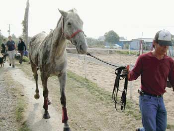 退役馬“曉康”獲救后,由職員帶返馬場(chǎng)。 明報(bào)圖