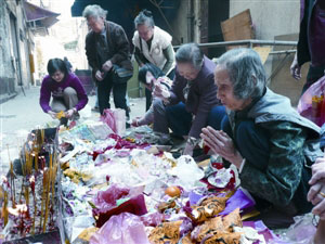 大興街附近的石敢當,門外設置多個售賣祭品攤位。有攤販表示,多年來生意并無太大變動,可見“打小人”習俗并沒有因為社會的進步而被遺忘,間中仍可見年輕女子加入“打小人”行列。