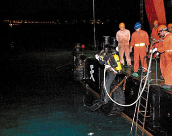 廣州打撈局的潛水員彭文科25日傍晚6時(shí)30分,緊接同事潛入海中探摸,10多分鐘后,對講機(jī)傳來看到“REST KICTEB AREA”的字母,沉船船長即表示彭文科已經(jīng)進(jìn)入到甲板休息室。彭文科聽從指示,用攜帶的導(dǎo)引繩系在門扣上,然后浮上水面。