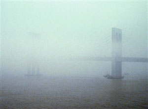圖:西灣大橋被霧靄包圍,如從中“斷開”。(圖片來源:澳門日?qǐng)?bào))