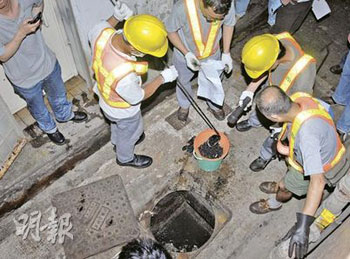 但街坊稱,兇案現(xiàn)場樓下的地產(chǎn)鋪和牛仔褲鋪的污水渠,近日傳出如“死老鼠“般惡臭。渠務(wù)署職員8日與探員到石硤尾現(xiàn)場一帶的沙井搜查,探員倒入化學(xué)顯影劑后利用弧光燈搜索,撈起兩團(tuán)懷疑碎肉,又收集了4盆淤泥,全部帶返警署調(diào)查。