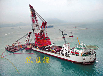 資料圖:由中國(guó)交通部廣州打撈局派出的大型打撈船“華天龍”,在香港水域小磨刀東面,成功將沉沒的烏克蘭補(bǔ)給船的煙囪及駕駛艙部份吊出水面。 中新社發(fā) 鄧慶樂(lè) 攝