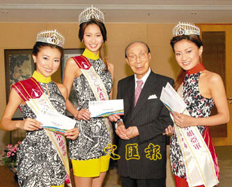 邵逸夫爵士頒獎(jiǎng)給三位港姐得獎(jiǎng)佳麗。(圖片來(lái)源:文匯報(bào))