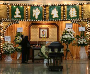 靈堂設(shè)于世界殯儀館一樓世界堂,布置莊嚴(yán)肅穆,靈堂正上方懸掛著“往生凈土”的橫幅,兩旁是“浩氣長存、哲人其萎”的挽聯(lián),下方擺放了蘇志豪生前的軍裝遺像,兩旁擺放著親屬敬獻(xiàn)的花籃,靈堂四周圍著白布,擺滿各界人士敬獻(xiàn)的花圈,兩輛紙?jiān)?duì)電單車放在靈堂旁邊。