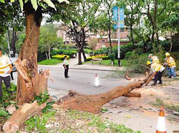 中新網(wǎng)9月3日電 據(jù)香港文匯報報道,香港赤柱繼上周三發(fā)生百年古樹砸死19歲香港大學女生莊頌賢后,附近赤柱村道2日也出現(xiàn)另一棵呈V形生長逾60年樹齡老樹,也因被侵蝕過度有半邊大樹倒下,幸好沒有造成傷亡。