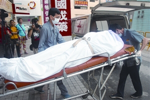 死者遺體由仵工送往殮房處理。(圖片來(lái)源:澳門日?qǐng)?bào))