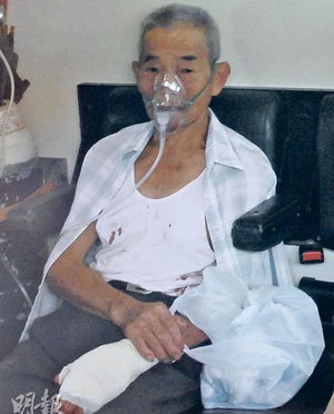 年邁的陳父左手腕受傷,在場(chǎng)接受包扎后送院治理。(圖片來(lái)源:明報(bào))