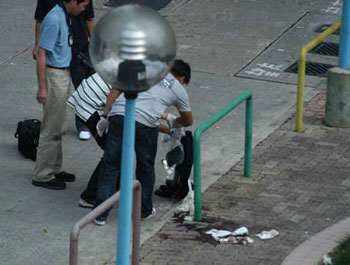 探員檢走中槍疑人的染血長(zhǎng)褲。(圖片來源:大公報(bào))
