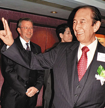贏了官司,何鴻燊向記者舉起勝利手勢。(圖片來源:文匯報)