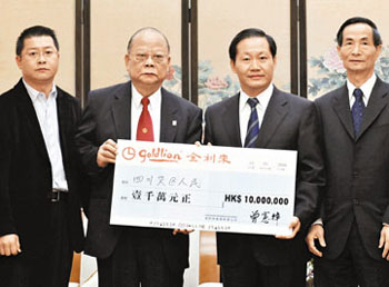恒基兆業(yè)集團(tuán)主席李兆基亦于14日委托次子李家誠送交由恒基兆業(yè)地產(chǎn)有限公司和中華煤氣公司捐贈(zèng)的1000萬元賑災(zāi)支票。