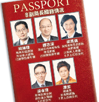 29日,除了已外游的候任運(yùn)輸及房屋局副局長(zhǎng)邱誠(chéng)武,各副局長(zhǎng)都已回復(fù)傳媒查詢(xún)。候任財(cái)經(jīng)事務(wù)及庫(kù)務(wù)局副局長(zhǎng)梁鳳儀、候任環(huán)境局副局長(zhǎng)潘潔、候任食物及衛(wèi)生局副局長(zhǎng)梁卓偉3人仍未決定如何處理外國(guó)國(guó)籍或居留權(quán)。