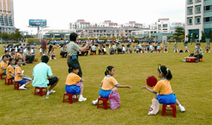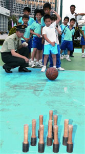 今年“六•一”兒童節(jié)參觀軍營活動一改過往只設參觀的單向活動方式,新增了一批駐軍官兵與小學生互動的游園和娛樂活動,包括有軍事常識問答、猜謎語、“擊鼓傳花”、水上漂、釣魚、保齡和拔河等游戲,學生與駐軍官兵打成一片,學生歡愉的笑聲傳遍整個軍營。不少學生紛紛站在升旗臺、輪式裝甲車上,與官兵拍照留念。